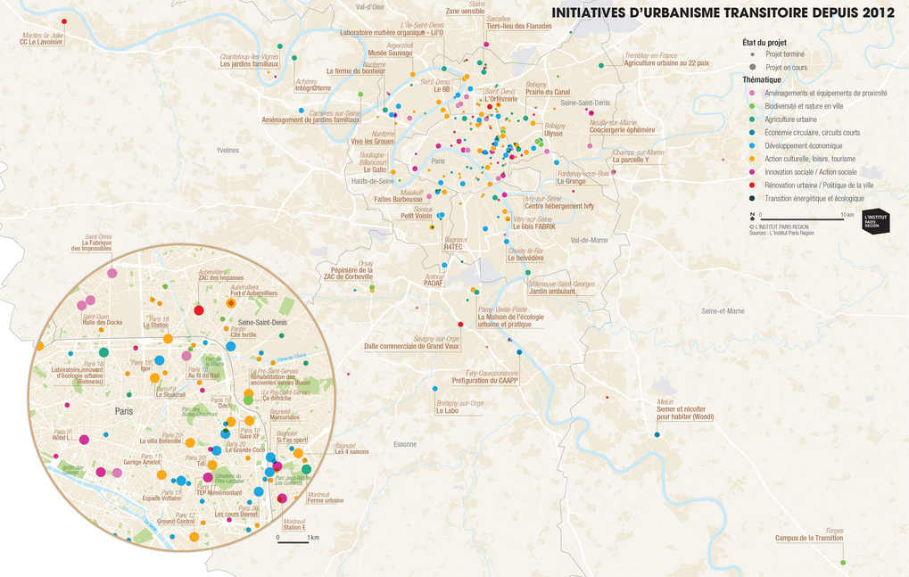 La répartition géographique des 227 projets depuis 2012 est marquée par une prédominance de Paris (30 %) et du département de Seine-Saint-Denis (33 %), avec notamment une forte présence des établissements publics territoriaux (EPT Plaine Commune et Est Ensemble), dont la profusion de projets est portée par la rareté de l’espace disponible à Paris, et le nombre important de friches et de bâtiments vacants en Seine-Saint-Denis. Il faut noter cependant une légère inflexion, qui voit remonter la grande couronne à partir de 2019 : alors qu’elle représentait 11 % des nouveaux projets entre 2012 et 2016, le chiffre monte à 22 % entre 2019 et 2022. Enfin, il faut souligner la diffusion de l’urbanisme transitoire dans d’autres villes françaises : Grenoble, Lyon, Marseille, Bordeaux, Strasbourg, Amiens…