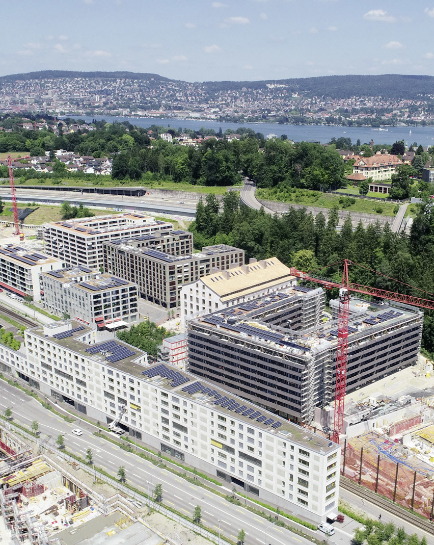 Die erste Etappe von Greencity umfasst fünf Wohnbauten auf den Baufeldern A1 westlich der Haltestelle, B4S und B3S nördlich von Spinnerei und Spinnereiplatz und den nördlich an sie anschliessenden Baufeldern B4N und B3N. Diese «Pionierneubauten» erfüllen einerseits eine Portalfunktion für das neue Quartier in südlicher und nördlicher Richtung. Andererseits geben sie dem differenzierten Freiraumkonzept von Greencity eine Form: Die beiden Höfe von B4S und B4N öffnen sich nach Osten, zum Grünraum am Hangfuss, der mit Park- und Spielplatzmobiliar ausgestattet ist. Nach Westen begrenzen die beiden Volumen mit ihren Gegenübern B3S und B3N die zentrale, gepflasterte Platzfolge mit kleinen Grünanlagen auf dem Maneggplatz. Die Erdgeschosse auf diesem Niveau dienen ausschliesslich öffentlichen Nutzungen und dem Gewerbe.