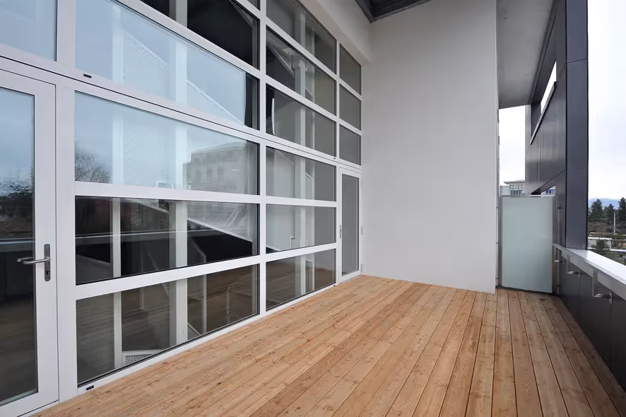 Côté esplanade, des balcons aux dimensions « intimistes » se glissent entre la façade et une double-peau placée devant celle-ci. A l’ouest, ce sont des terrasses plus spacieuses qui s’étendent face à la zone de verdure. Les deux façades, aux aspects variés s’animent encore par les variations colorées des stores de chaque logement.