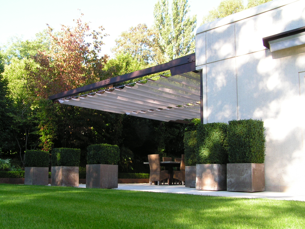 Sur mesure, en aluminium et inox, avec lames orientables, rétractables ou toile (vélum), stores et voiles selon les spécificités voulues.
