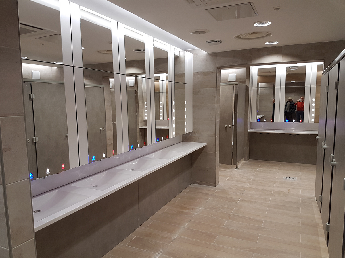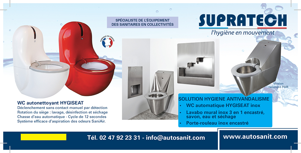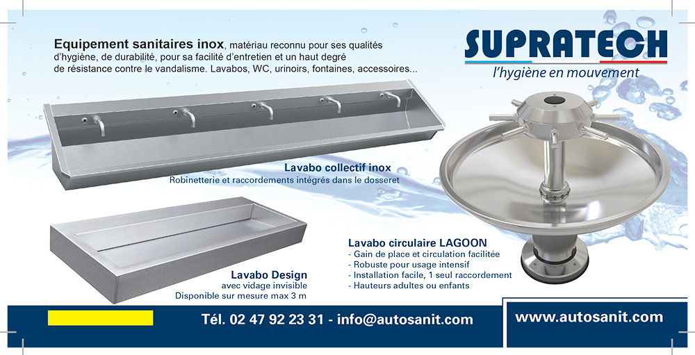 Tous les éléments nécessaires à l’aménagement de lieux sanitaires publics résistants aux tentatives de vandalisme dont ces lieux peuvent être l’objet (lavabos, miroirs, cuvettes, distributeurs de toutes sortes) toujours dans une exécution en acier-inox brossé ou brillant dont l’épaisseur est de 1,5 mm avec pour la plupart de ces appareils les espaces fermés remplis de mousse polyéthurane prévenant le bruit et les tentatives d’enfoncement.