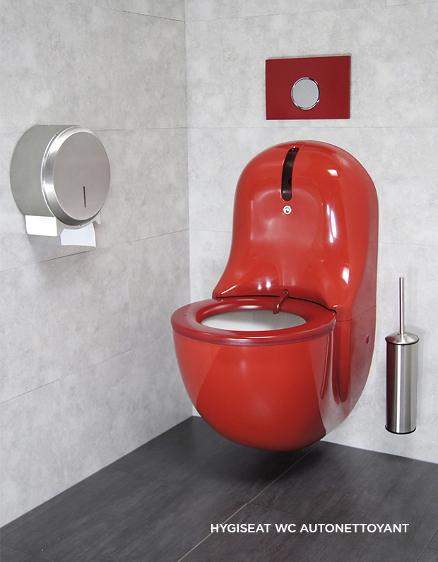 WC autonettoyant HYGISEAT dans diverses exécutions PMR et couleurs permettant à notre GERMIBLOC l’éradication, grâce à un combiné de désinfectants à large spectre contenu dans notre composition désinfectante approuvé et accepté par les milieux hospitaliers et agissant sur la plupart des germes, virus (y.c. HIV), champignons et bactéries.