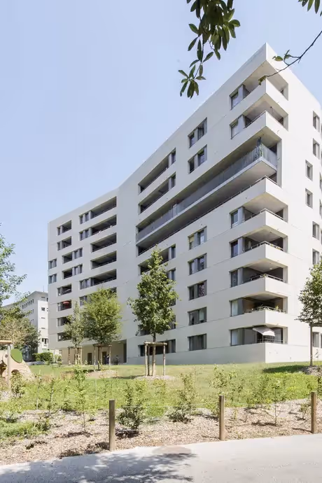 The residential building at the northwest end of the construction site has 18 owner-occupied flats with ingenious floor plans, superb fittings and furnishings, spacious outdoor areas and two commercial spaces.