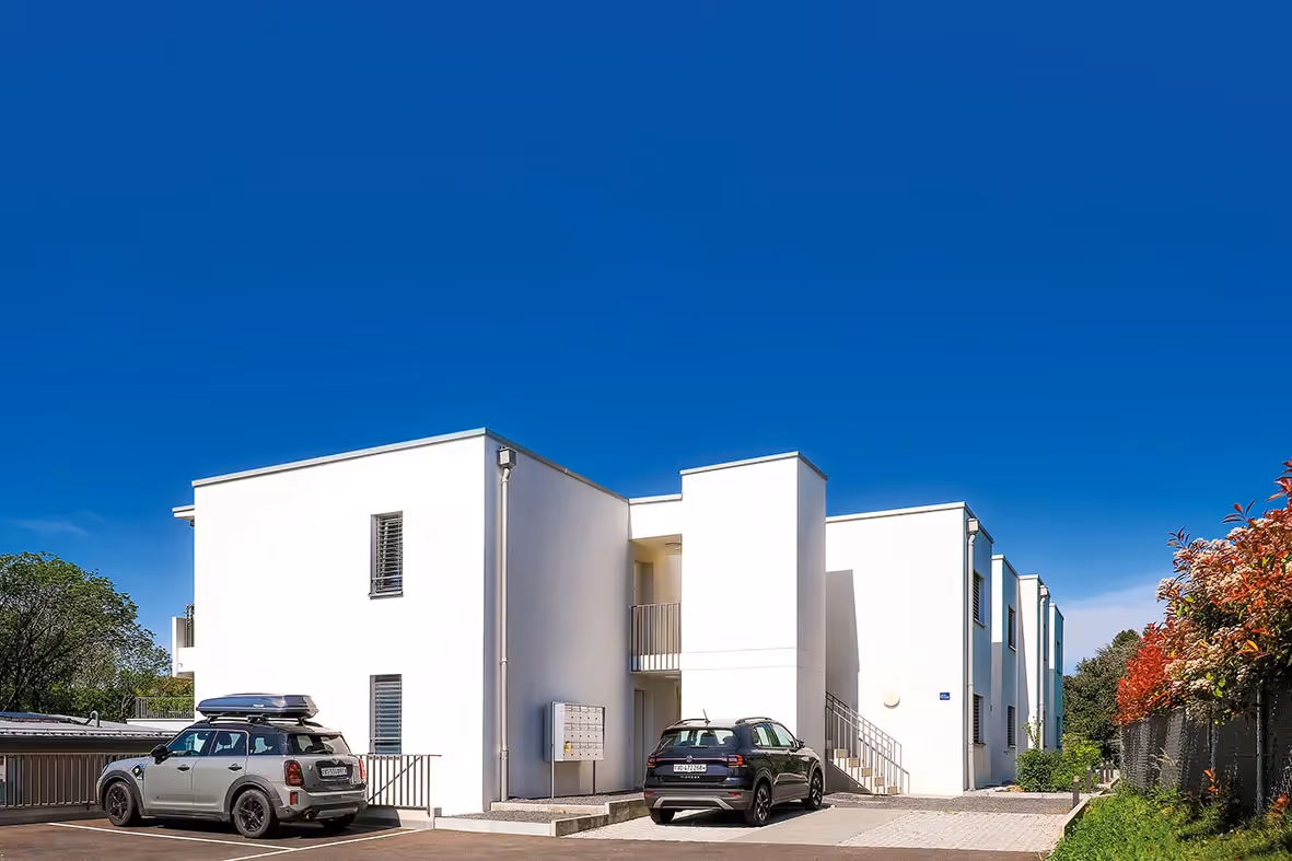 Dans une zone de faible densité qui réunit principalement des villas, il importe que l’accès aux appartements se fasse directement depuis l’extérieur pour avoir un sentiment d’indépendance à la différence de l’accès aux immeubles collectifs. C’est le cas dans les deux projets. Un décalage de façades entre chaque unité de logements ou le découpage du volume extérieur accentuent l’apparence de maisons contiguës. La typologie des logements concentre les entrées au Nord, côté route, les balcons au Sud, côté lac. Le traitement des matériaux et le détail des balcons font l’objet de soins particuliers et les parkings extérieurs couverts diminuent l’impact en sous-sol.