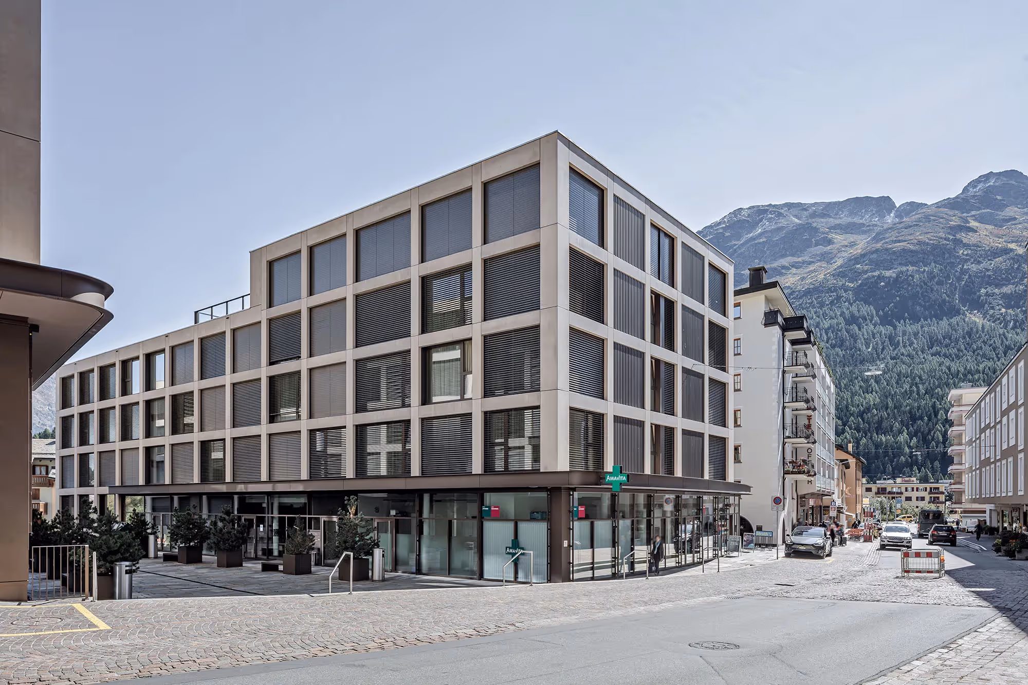 Al livello della strada e in prossimità del passaggio, nella parte bassa sono collocati diversi spazi commerciali vetrati dalle superfici generose, che nella loro disposizione circoscrivono l’appezzamento e sono affiancati da eleganti tettoie rivestite in lamiera di alluminio color bronzo arrotondate negli angoli. La parte del basamento su Via Grevas è rivestita in pietra naturale, mentre i due corpi principali vi sporgono leggermente sopra. Qui si trovano l’ingresso e l’uscita del garage. Nel mezzo, ai piedi della scala esterna, è collocato un negozio. L’allestimento degli spazi esterni tiene conto del dislivello, collegando elegantemente i diversi livelli attraverso gradini curvi che seguono l’andamento della Via del Bagn, in parte lastricata. Le lastre in pietra naturale del rivestimento esterno creano un collegamento armonioso con la pavimentazione adiacente.