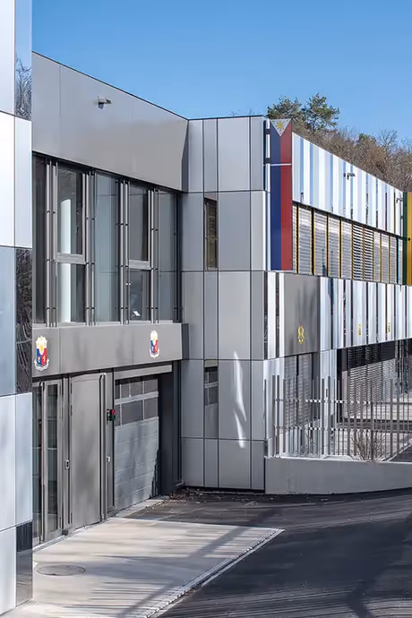 La conception des façades varie en fonction de l’utilisation. Des revêtements métalliques apparaissent comme des éléments de liaison. Dans les locaux commerciaux du rez-de-chaussée, les tôles sont régulièrement pliées, créant ainsi un jeu d’ombre et de lumière. Les différents étages des immeubles résidentiels sont mis en valeur par des corniches périphériques. Les balcons, qui, comme les fenêtres, sont légèrement décalés sur chaque étage, s’avancent dans la cour. Les bords des toits des immeubles résidentiels sont également en saillie. Le choix des couleurs souligne une division classique des façades en trois parties horizontales. Avec cette conception, les architectes ont créé une impression à la fois intemporelle et ludique.