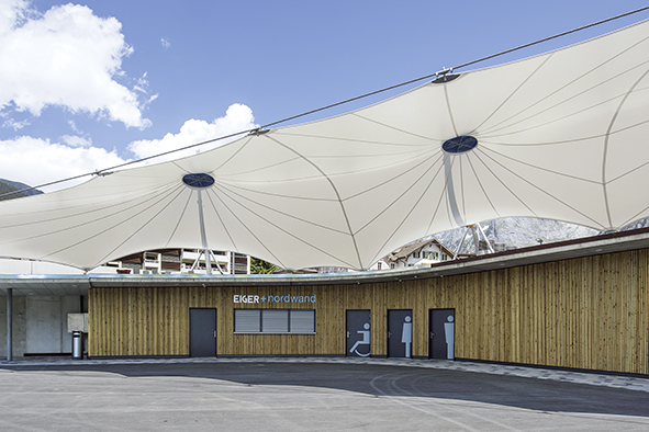 Der Baukörper des DLZ wächst in geschwungener Form aus dem abfallenden Terrain und öffnet sich in Richtung Bahnhof. Ein vorkragendes, hufeisenförmiges Betondach akzentuiert die elegante Form des Volumens. In Verbindung mit der vertikal ausgerichteten Lamellenfassade aus Holz ergibt sich ein harmonisches Ganzes. Vom Parkhaus, das über einen Tunnel direkt mit dem Einkaufszentrum verbunden ist, bleibt nur das Zugangsgebäude vor dem benachbarten Sportzentrum sichtbar.
