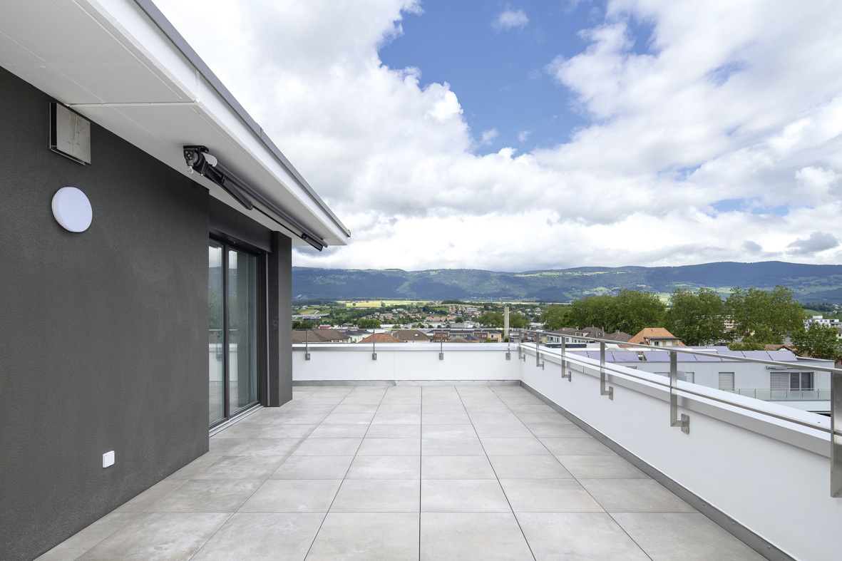 Sur le plan de l’exécution, l’immeuble de la rue des Fleurettes présente quelques différences avec les deux volumes voisins de l’avenue de Grandson, des constructions standards avec isolation périphérique. Dans le cas d’espèce, les concepteurs ont fait le choix d’une façade ventilée avec panneaux Eternit rainurés, des plaques en béton composite qui présentent un aspect céramique. Seul le niveau en attique hérite d’une isolation périphérique.