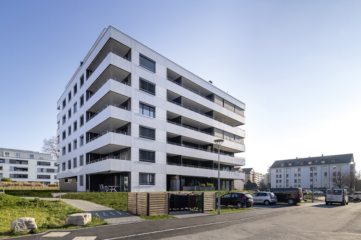 De grands balcons-loggias intégrés à l’emprise du bâtiment prolongent les surfaces de logements. Des bandeaux horizontaux entourent la totalité de la façade, marquant ainsi la division entre les différents étages. Le septième niveau est en attique, une configuration imposée par le plan de quartier, au même titre que la hauteur de gabarit et la limite au sol.