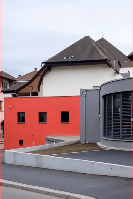 Une construction d’emblée spectaculaire. D’architecture sobre, le bâtiment s’articule en 3 volumes imbriqués, se distinguant chacun par leur traitement de façade. Les teintes différenciées, du noir au gris alu et les décrochements tant en plan qu’en hauteur, permettent de diminuer l’impact visuel de l’ensemble. De nombreuses ouvertures et une terrasse extérieure pour la cafétéria contribuent également à l’élégance de la halle, destinée à l’accueil du public.