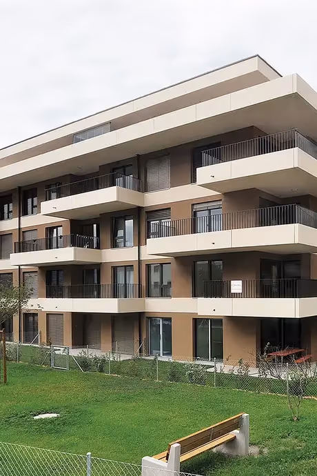Distribués par de généreux noyaux verticaux, les 84 appartements – cinq par étage – proposent des pièces agréables, éclairées par de larges fenêtres. Un cadre doux et serein particulièrement présent dans les espaces à vivre où salon, cuisine et coin repas s’articulent autour d’une loggia (souvent) en angle, ouverte sur le paysage alentour. Les finitions intérieures participent encore de cette belle habitabilité avec, pour les logements, du parquet en chêne ou du carrelage type grès cérame et, pour les locaux communs, des plaques en terrazzo et des portes en chêne. Placées au centre des façades longitudinales, les entrées des bâtiments accueillent des espaces de rangement pour vélos et poussettes, ainsi qu’une salle commune.  Un choix judicieux qui invite à la rencontre et à  la convivialité entre locataires.
