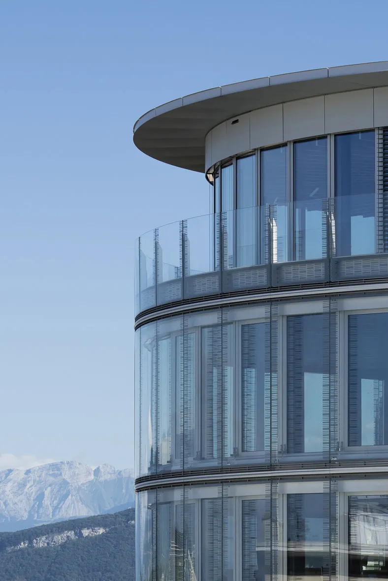 Der Turm, der sich aus den Geschossen ergibt, ist eine kompakte Einheit mit sanften und fliessenden Formen und verleiht dem Gebäude eine einzigartige und kraftvolle Identität. Eine unregelmässige Dreieckstruktur mit stark abgerundeten Winkeln unterstreicht die gut durchdachte Anordnung. Diese garantiert eine bestmögliche Orientierung und freie Sicht, auch für die benachbarten Gebäude. Das grosse Erdgeschoss ist konventioneller, rechteckiger gestaltet und verbindet sich harmonisch mit der Umgebung, sei es mit dem bestehenden Gebäude oder mit der Strasse selbst.