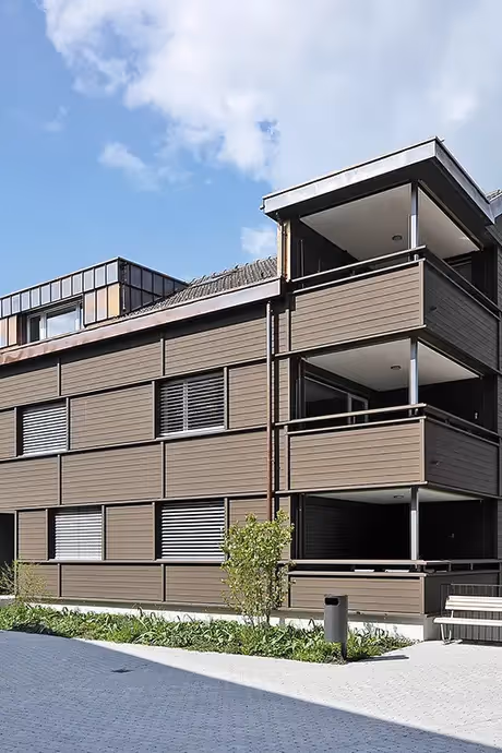 Les deux longues façades sont traitées de façon distincte, en fonction de l’orientation, mais avec des références connexes. Ainsi, sur les petits balcons qui animent une façade Est très minérale, on retrouve le même type de garde-corps au verre teinté que sur les loggias généreusement ouvertes à l’opposé, du côté du soleil couchant. Ce vocabulaire contemporain, au rythme strict sur les rez-de-chaussée et plus aléatoire sur les étages courants, ne rejette toutefois pas les références traditionnelles. C’est doublement le cas avec les éléments de béton préfabriqué dont la matérialité rugueuse apparaît comme un clin d’œil aux enduits anciens, voire à la pierre brute, et dont le décor sérigraphié – le dessin de fenêtres aux proportions classiques – se révèle comme un palimpseste de la tradition architecturale carougeoise. À cette expression tout à la fois simple et inattendue s’ajoute aussi des options chromatiques retenues qui, du gris clair au brun sombre, semblent faire écho aux teintes issues de matériaux de construction naturels tels que la roche, le bois ou la terre cuite.