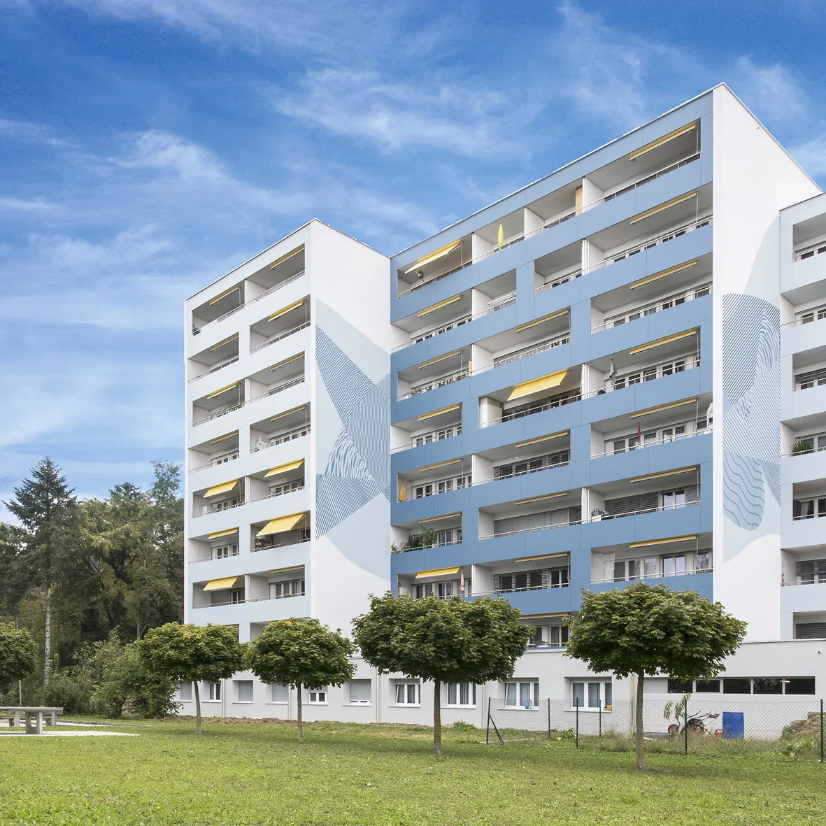 parties de façade borgne. Désormais l’immeuble se distingue des autres et participe au panachage général qui est à l’oeuvre dans le quartier, ce qui vient judicieusement briser son uniformité originelle. Cette rénovation a également apporté un confort thermique accru pour les locataires, grâce à la pose d’une isolation périphérique en façade et la réfection du complexe étanchéité isolation des toitures plates. À l’intérieur, les travaux ont portés sur la mise en conformité des portes palières et communes selon les normes incendies actuelles. De nouveaux garde-corps ont également été posés dans les cages d’escaliers. Suite aux travaux de rénovation, il a fallu procéder au réensemencement du gazon autour de l’immeuble et par la même occasion l’opportunité a été saisie pour réaliser l’aménagement d’une place d’accès pour les véhicules de secours.