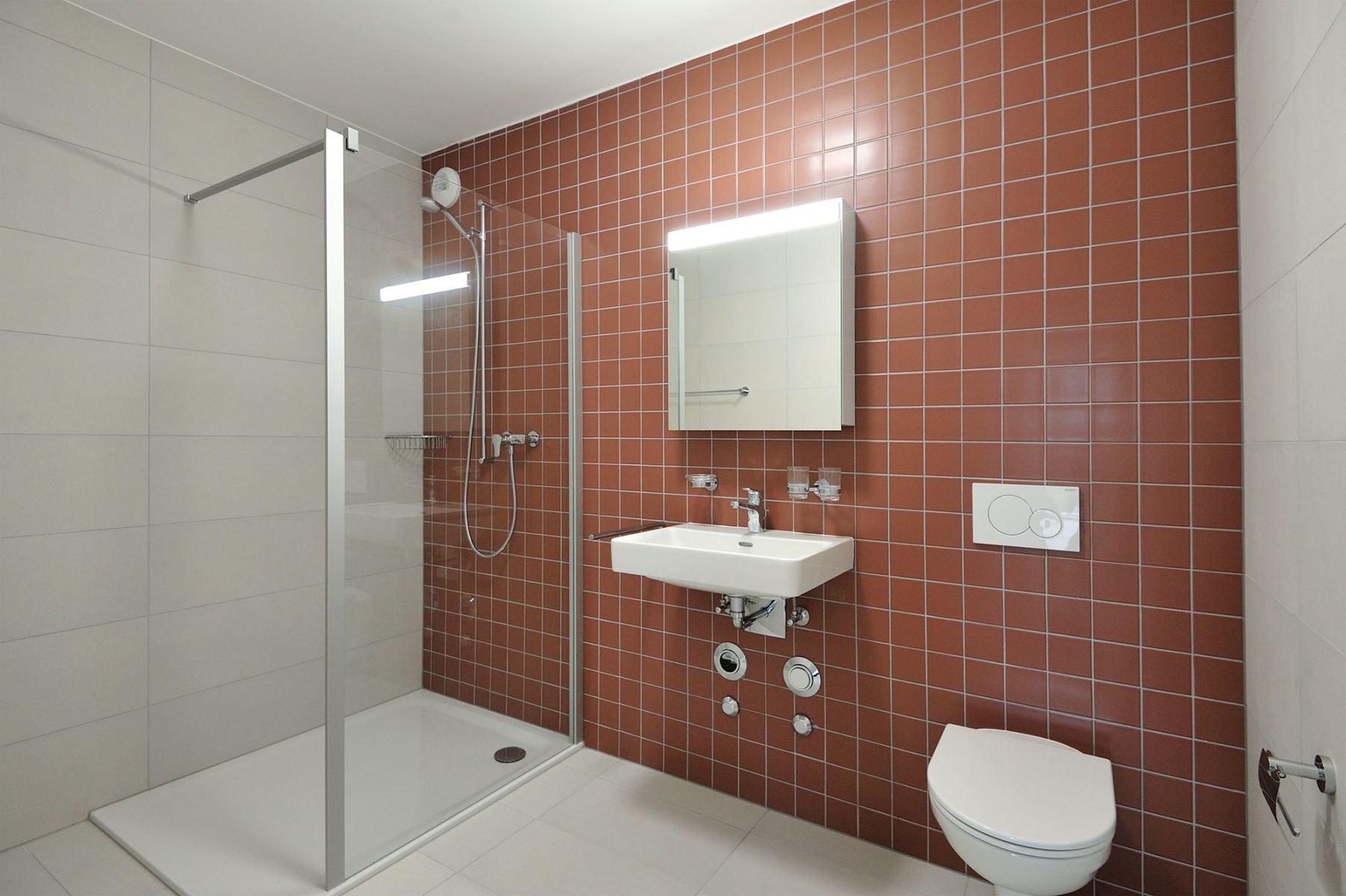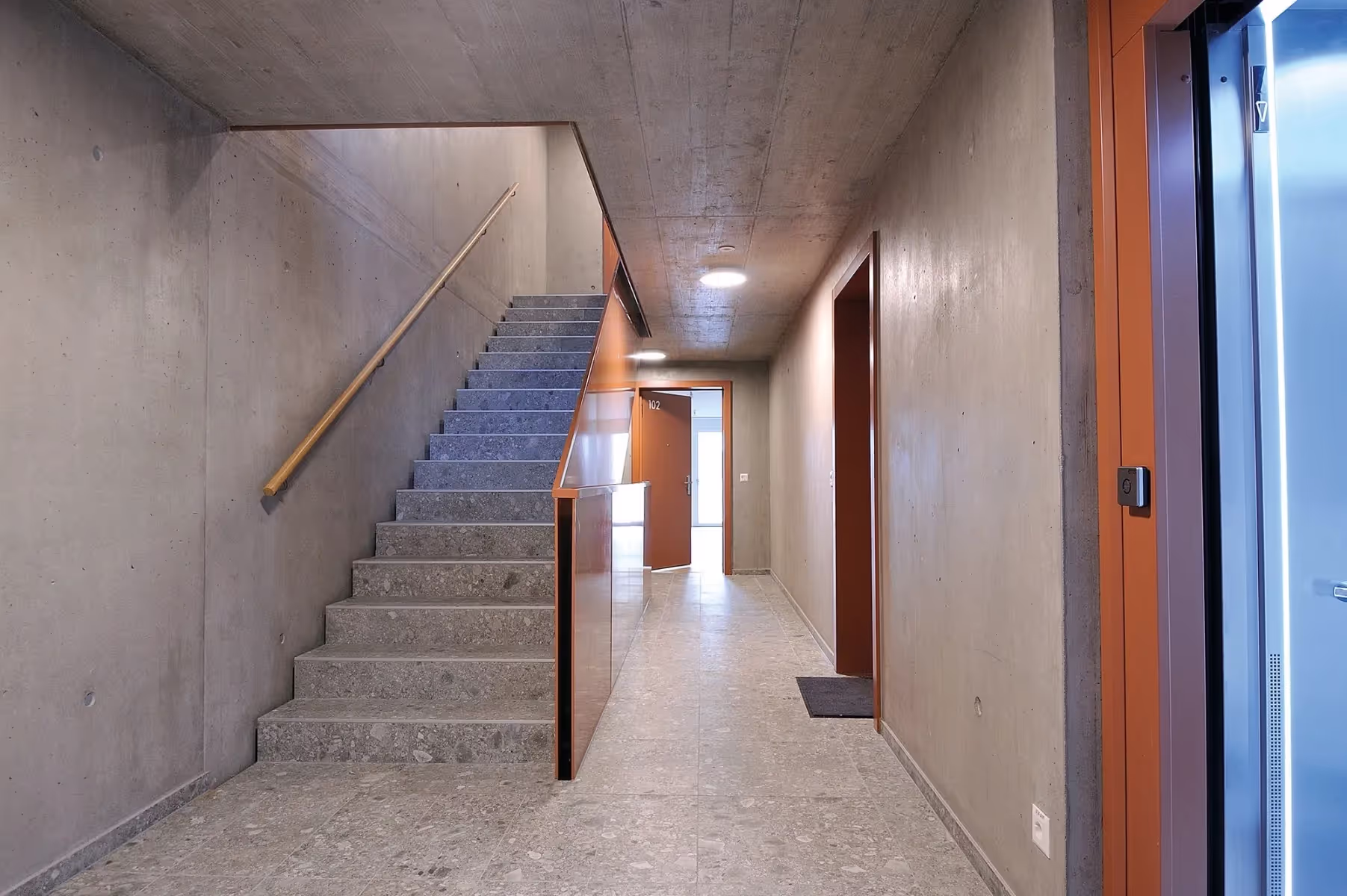 Les typologies des appartements, quelle que soit leur taille, obéissent au même principe : cuisines ouvertes et salles de bain à l’arrière, pièces à vivre et chambres donnant vers la rivière grâce à l’emploi généralisé des larges baies vitrées ouvertes vers les balcons ou terrasses en RDC. Les intérieurs sont élégants et lumineux, dotés de parquets en chêne, sauf pour les appartements PMR, équipés de sols en lames PVC, mieux adaptés à la circulation de fauteuils roulants. Les installations sanitaires sont également pensées pour faciliter la mobilité : douches à seuils plats ou douches à l’italienne pour les appartements PMR. Les cuisines et salles de bain présentent des sols en grès cérame et des parements en carreaux de faïence. Les espaces de circulation communs reçoivent eux aussi un traitement évoquant l’esthétique industrielle, avec des murs en béton brut et des sols gris, animés par des touches de couleur des portes palières, rambardes et ascenseurs. Ainsi la revitalisation de ce quartier se fait dans le respect de son histoire et le rappel de ses activités passées, probablement encore présentes dans la mémoire de certains résidents plus âgés.