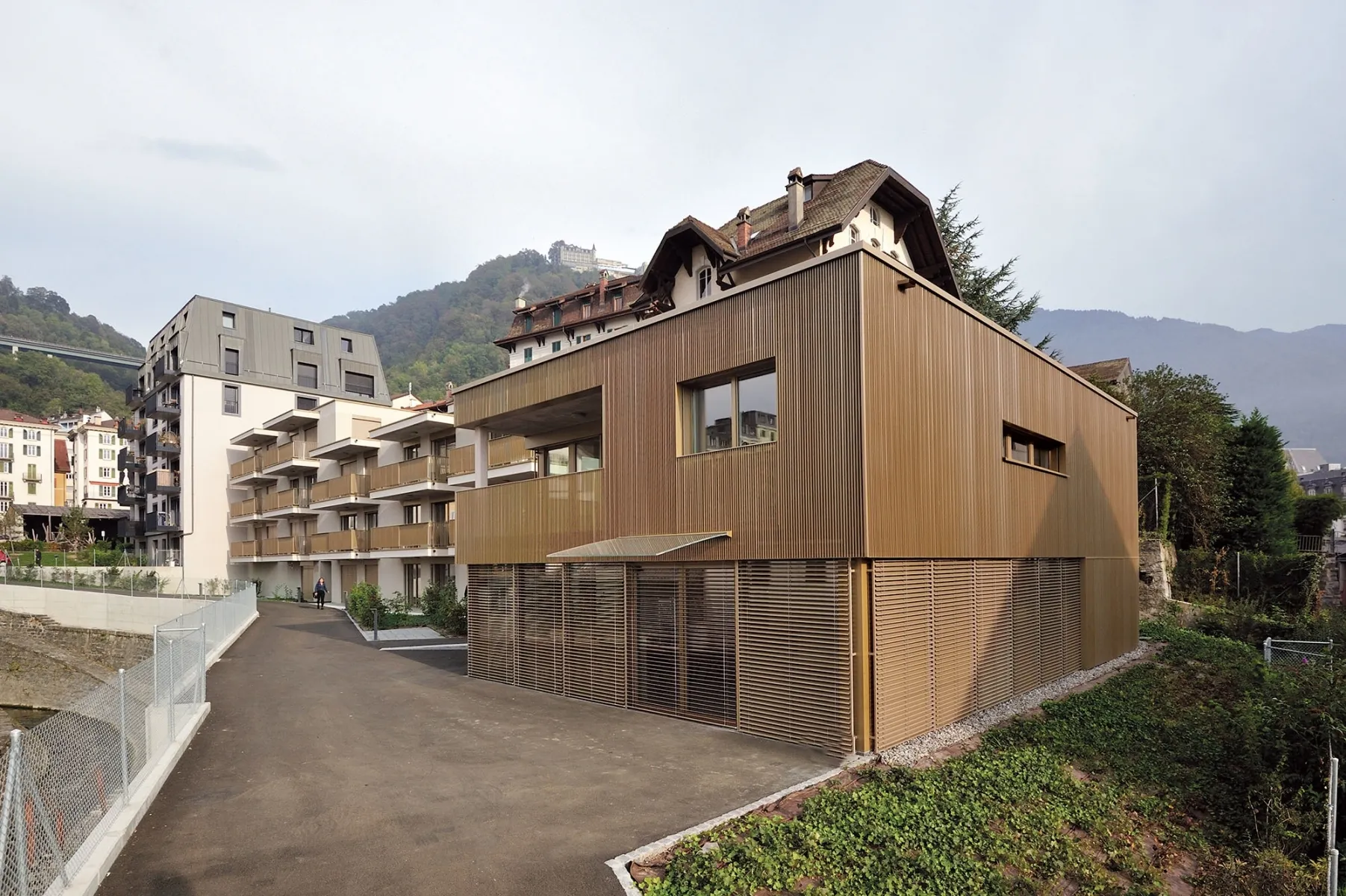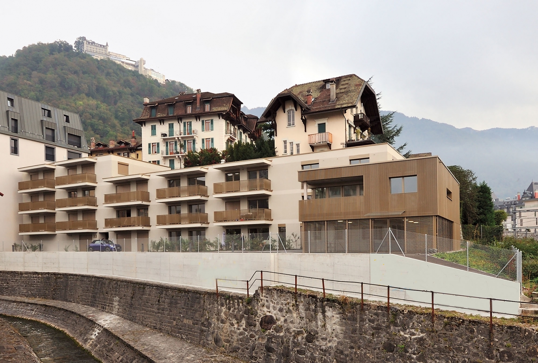 Dans le quartier de la Corsaz à Montreux, en pleine mutation depuis le plan de requalification de cette ancienne zone industrielle adopté en 2015, une nouvelle résidence locative pour personnes âgées a vu le jour à l’automne 2023. Mené par Retraites Populaires pour le compte de la CPEV, le projet, dessiné par le cabinet d’architecture lausannois CCHE, a été développé en collaboration avec l’association Pro Senectute Vaud. Il s’inscrit comme la deuxième étape de la revalorisation de ce quartier qui en comprendra trois. Idéalement situé à proximité des commerces et du centre-ville, le bâtiment est niché dans une courbe de la rivière Baye de Montreux, entre un groupe de trois nouveaux immeubles en amont, objet de la première étape du plan de quartier, accueillant une population dynamique et animée, et la voie ferrée en aval. La parcelle descend en pente douce en direction du lac et offre à ses résidents un cadre de vie paisible entre le Léman et les Alpes.
