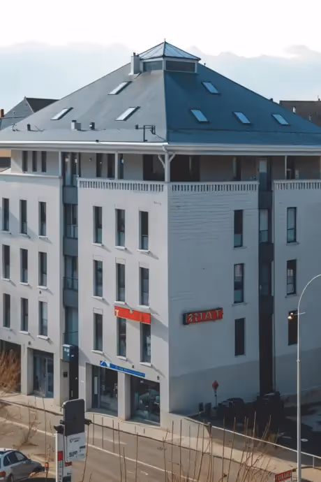 Ouvert sur le rond-point, un grand bâtiment de sept étages accueille des espaces de bureaux puis regroupe, dans son prolongement sur la rue des Deux-Ponts, des appartements pour étudiants et des logements sociaux. À l’arrière, un immeuble autonome propose sous un gabarit de R+4 des appartements en propriété par étage. En tout, plus de 1’600m2 de surface commerciale et pas moins de 42 unités d’habitations (dont 24 en PPE), un parking souterrain de 55 places et, dans la cour intérieure, un petit volume abritant une salle commune et un grand abri à vélos.