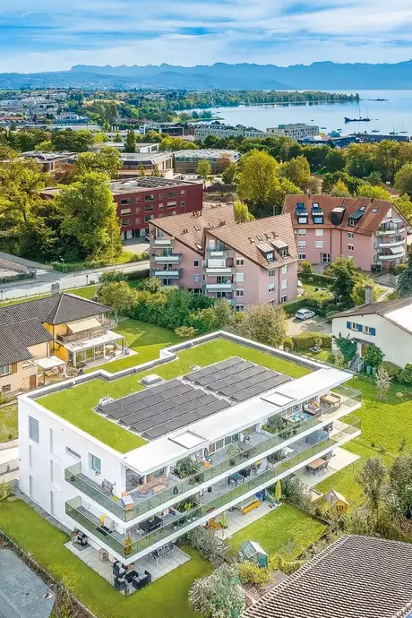 Le thème «développement durable» était au coeur du projet La Mandchourie. D’où le recours, côté chauffage, à un gaz naturel respectueux de l’environnement provenant du réseau régional de la ville de Delémont. L’énergie thermique est distribuée dans les logements et les bureaux via un chauffage au sol. La toiture est coiffée d’une installation photovoltaïque assurant une puissance de 80 Kilowatt Peak (kWp).