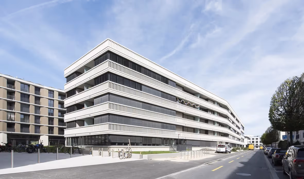 À l’intérieur des logements, les séjours et les chambres profitent d’une belle orientation et de fenêtres toute hauteur s’articulant autour de balcons-loggias. Au sol, on retrouve du carrelage et les équipements des salles de bains sont adaptés à des personnes à mobilité réduite. Les matériaux utilisés répondent au label DGNB®, concernant la construction durable, et au label Minergie®. À l’extérieur, la grande cour du bâtiment est aménagée avec trois surfaces successives répondant au programme des bâtis qui les bordent, soit un parc, un jardin d’enfants et un préau pour l’école. Des butées d’environ un mètre de haut viennent ponctuellement agrémenter cette cour en privilégiant certaines ouvertures visuelles et en permettant ainsi la plantation d’arbres tiges et des essences indigènes à des hauteurs différentes.