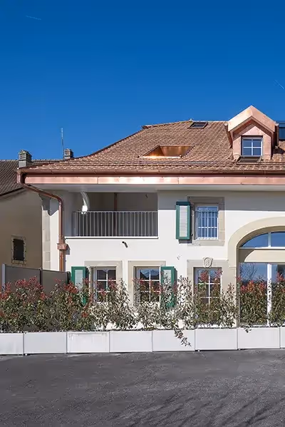 Des logements de standing où chaque détail compte. Dans un quartier résidentiel du Grand-Saconnex en périphérie de la ville de Genève, l’immeuble d’habitation, situé au chemin des Coudriers 45, est entouré de verdure. Sa façade en pierre naturelle capte la luminosité ambiante, ce qui modifie sa teinte au gré de la journée. Elle reflète tantôt des tons rosés, tantôt une coloration s’avoisinant au beige. Le projet s’élève sur deux niveaux en plus du rez, offrant des logements de 1½ à 5 pièces. Leur configuration varie entre des appartements sur un niveau, un duplex et également 2 “souplex” dont les sous-sols sont en partie habitables. Le reste des niveaux inférieurs étant utilisé pour le parking avec 16 places à disposition. Quant aux techniques, elles ont toutes été passées sur la dalle de toiture et dans un local au sous-sol directement accessible par l’extérieur.