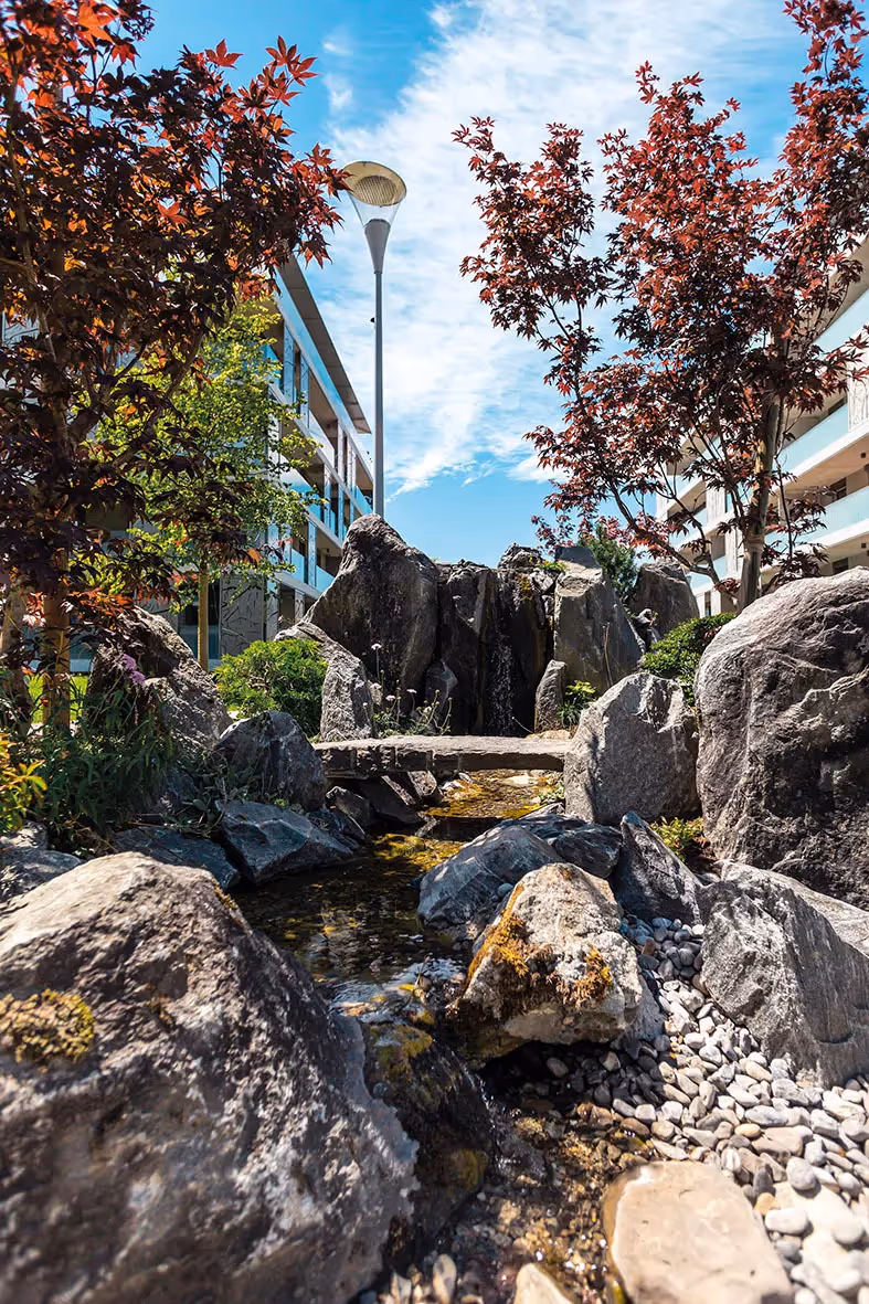 Des buttes en pleine terre évoquent les collines environnantes et permettent d’effacer la présence des parkings souterrains par la création de reliefs sur l’ensemble du projet. Elles favorisent également l’implantation sur dalle d’une végétation structurante, à l’image de celle du reste du parc. Ce dernier s’inscrit dans une interface ville-campagne et unifie les constructions et affectations. La diversité des promenades et des cheminements garantit la perméabilité du système par un accrochage aux rues et aux quartiers existants. Places de jeux et de rencontres, placettes publiques et jardins zen offrent une diversité d’ambiances pour le bienêtre des habitants et des usagers.