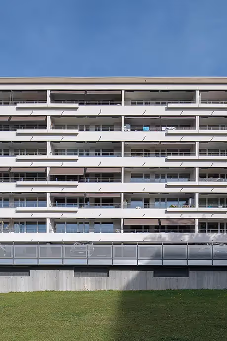 Avec une structure en béton armé et une isolation périphérique de mousse polyuréthane, la construction est facilitée par l’apport d’éléments préfabriqués tels que balcons et cages d’escalier. Réalisés de 2020 à 2021, les travaux ont dû s’adapter aux restrictions COVID mais aussi à la place disponible en raison de l’emprise au sol complète des sous-sols. Les intérieurs bénéficient de finitions de qualité et sont pourvus de nombreux espaces de rangement intégrés. Le standard THPE (Très Haute Performance Energétique) est atteint grâce à l’optimisation de l’isolation thermique de l’enveloppe, des moyens de production de chaleur et d’eau chaude et des systèmes de ventilation. Un bureau d’ingénieurs spécialisés a été mandaté pour l’application de ce standard. Le chauffage est assuré par deux pompes à chaleur air-eau et une PAC eau-eau raccordée sur deux batteries de récupération de chaleur de l’air extrait. Disposés en toiture, les monoblocs de ventilation renouvellent l’air par le système du simple flux. À l’extérieur, outre les surfaces engazonnées, des replantations d’arbres compensent les pertes selon les principes édictés par la DGNP et offrent un cadre verdoyant à l’ensemble.