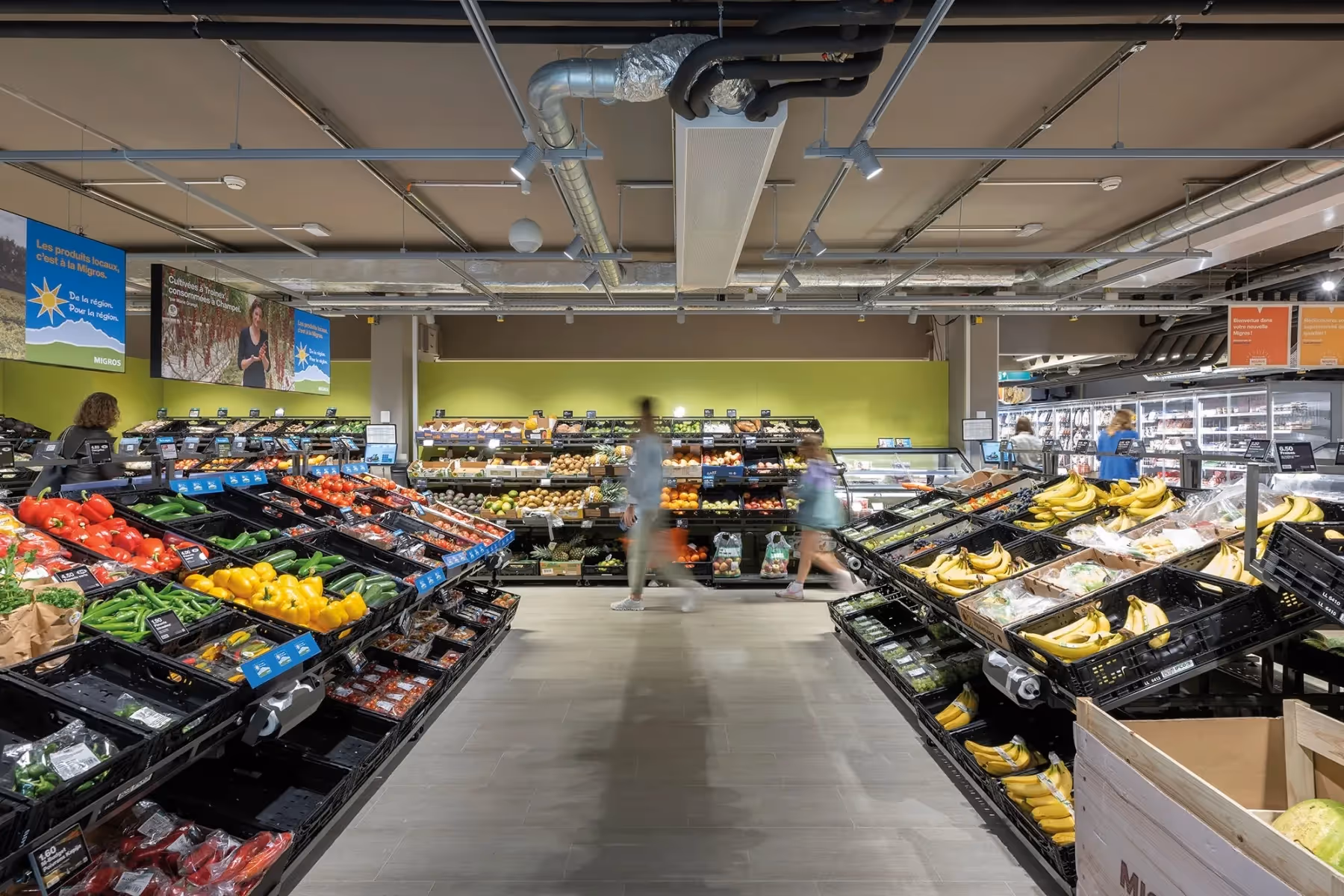 Il s’agissait de réaménager la surface commerciale en respectant les nouveaux standards et le code de couleurs des murs et des matériaux de Migros.