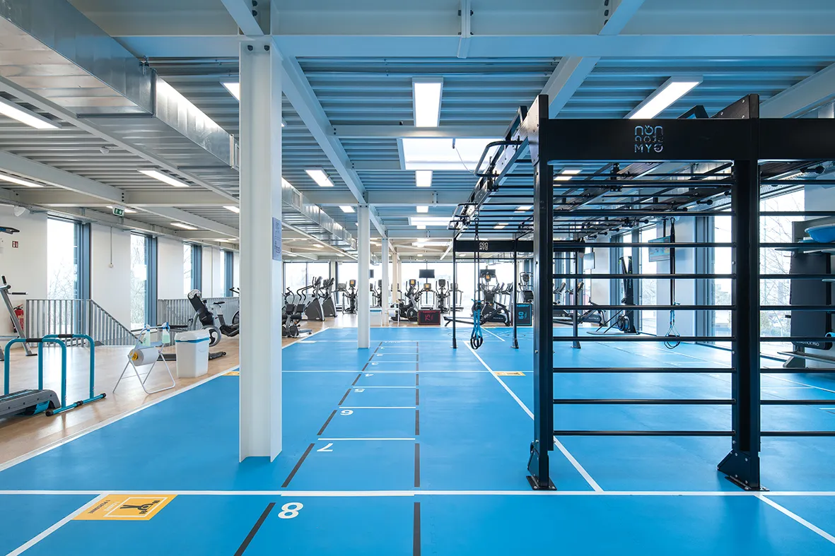 Le Maître d’ouvrage souhaitait que le nouveau bâtiment soit de type industriel mais que son enveloppe évoque l’idée de mouvement et de dynamisme. Destinée à accueillir un centre de fitness, la construction doit non seulement respecter les distances aux limites mais aussi tenir compte d’une servitude de hauteur. Le volume est implanté dans une légère pente et composé de deux niveaux de grande hauteur. Au nord, la partie enterrée accueille l’ensemble des techniques, les locaux sanitaires et les vestiaires. Côté sud, un mur périphérique extérieur forme un arc-de-cercle devant la façade principale et offre un espace de dégagement pour le niveau inférieur au terrain naturel. La rampe d’accès s’inscrit dans la continuité du cheminement extérieur et devient un élément architectural fort à l’entrée du bâtiment. Le fitness et ses installations sont répartis sur les deux niveaux, dans les espaces totalement dégagés et baignés de lumière grâce aux grandes surfaces vitrées. Orienté vers le Léman, le bâtiment met en exergue, à l’étage supérieur, le magnifique panorama. Un rythme dynamique est apporté en façade par le jeu des lignes dessinées par le regroupement de panneaux d’habillage de formes trapézoïdales diverses. Ces panneaux se superposent à la façade sur trois côtés, en créant par leur alternance avec les surfaces vitrées en retrait, un mouvement énergique, un élan vers le sud où la face est entièrement vitrée.