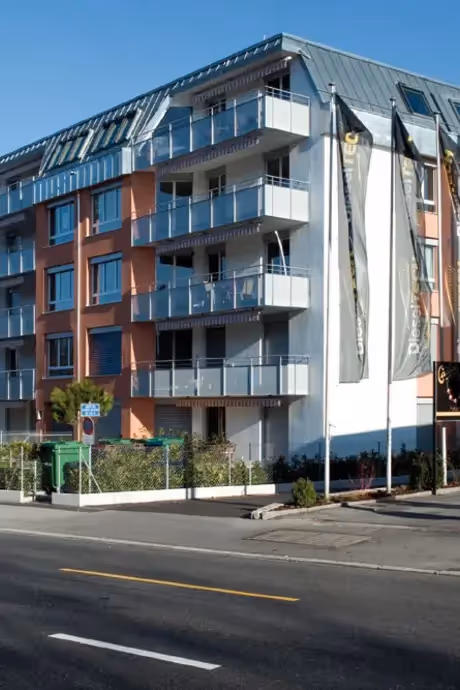 En face, le bâtiment réservé au logement s’intègre au quartier existant et présente un angle opposé qui crée ainsi, au Nord, une cour protégée. Les cinquante-cinq appartements présentent une typologie très ouverte qui favorise les espaces à vivre. Orientés plein Sud, ils jouissent d’une luminosité maximale et de grands balcons qui s’ouvrent sur le Léman et les Alpes. Entre les deux bâtiments, l’aménagement d’une cour intérieure préservée sert de lien entre les immeubles et fait la liaison entre le monde du travail et celui de la vie familiale.