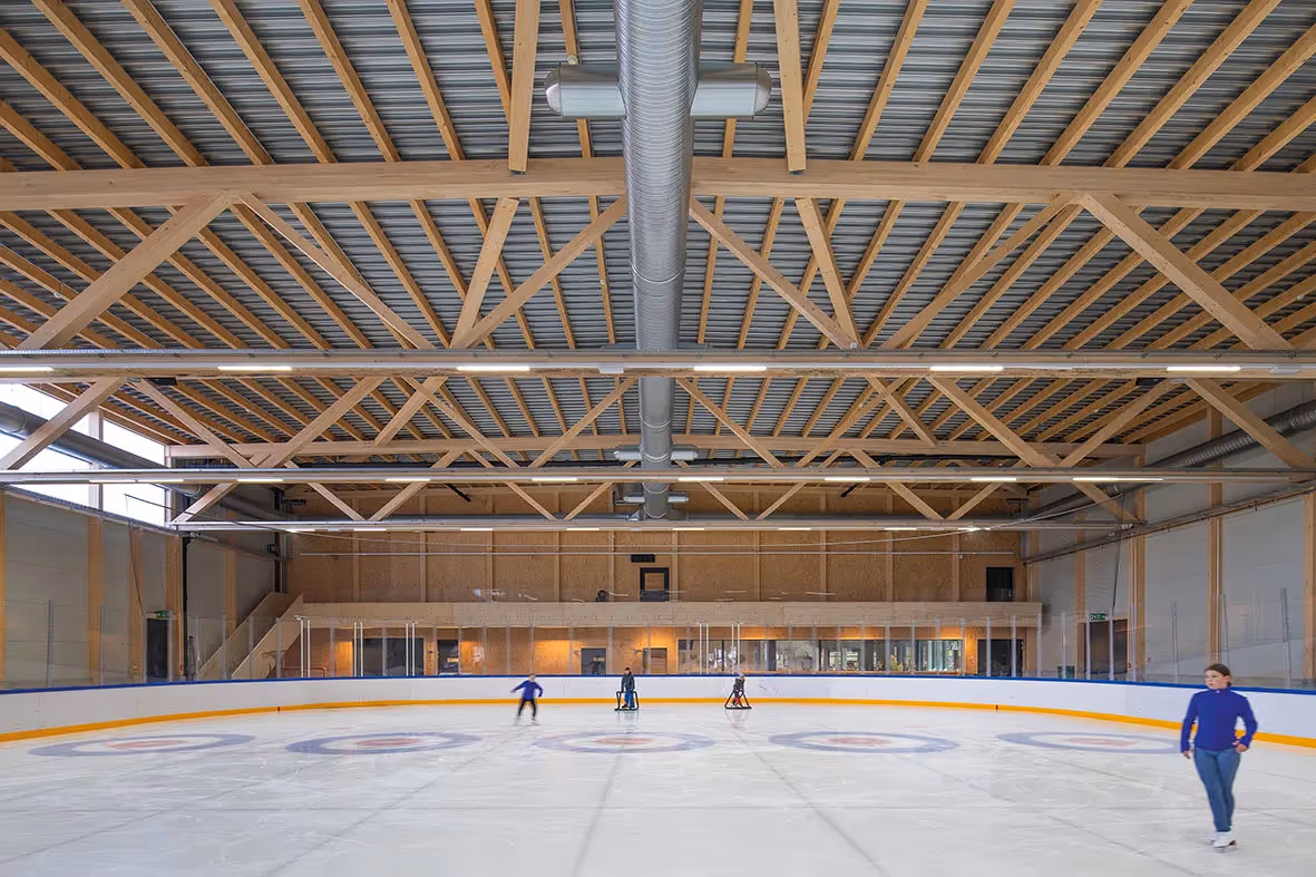 L’installation du nouveau programme dans l’enceinte exige une modification complète de la patinoire existante. Les éléments de structure et les fondations du bâtiment d’origine sont maintenus et la toiture est remplacée par un toit à deux pans à faible pente. La conservation de ces parties conditionne le nouveau plan, une base rectangulaire prolongée côté ouest par un second rectangle plus petit. Aux réflexions liées à la conception de l’ensemble s’ajoutent deux objectifs majeurs formulés par le Maître d’ouvrage, faire participer les entreprises jurassiennes au projet et utiliser les ressources locales, c’est-à-dire le bois, pour la construction. Ce dernier est donc privilégié pour tout ce qui a trait aux agrandissements (loges, gradins, tribunes) et pour les structures des toitures. Les essences de hêtre, frêne et résineux sont choisies en fonction des spécificités et des besoins du programme. Dans la mesure du possible, les matériaux sont laissés bruts et expriment leur matérialité.