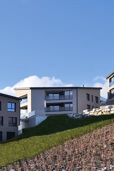 Le projet se compose de deux immeubles résidentiels distincts attenants aux deux rues. Ils s’élèvent sur un «niveau-socle» de la longueur du terrain. Accueillant une filiale d’une chaîne de commerce de détail dont l’entrée donne sur la rue principale ainsi que des bureaux et entrepôts. Outre l’accès au magasin, des places de parc extérieures sont à disposition à l’ouest du niveau-socle. À l’est, une rampe mène au sous-sol et dessert le parking souterrain. La façade côté rue principale est en repli par rapport à la perspective, des arbres ont été plantés sur le toit végétalisé du socle. Une haie importante se déploie le long de la limite de la parcelle ouest.