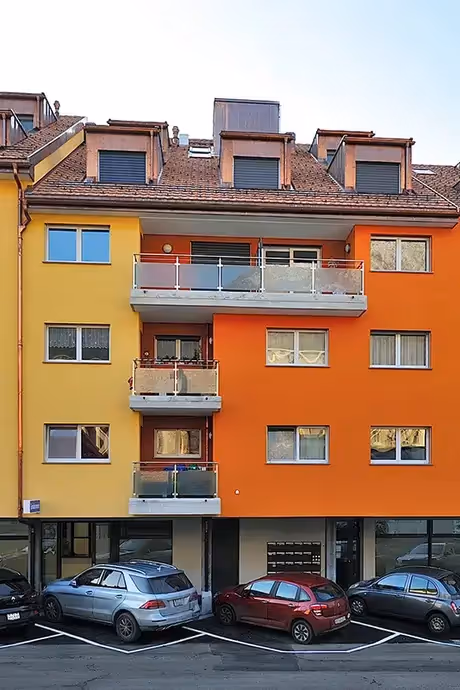 Avec sa structure béton et ses faces arrière et avant en poteaux-traverses, l’édifice se distingue par ses larges ouvertures permettant à la lumière d’inonder aussi bien les surfaces commerciales du bas que les étages supérieurs. Alternant le blanc et le gris, l’enveloppe recouvrant l’isolation périphérique est constituée de tôles Montana. Le choix des vitres teintées au rez et au 1er étage est dicté par l’absence de stores à lamelle sur ces deux niveaux. Des panneaux solaires thermiques et photovoltaïques viennent coiffer la toiture.
