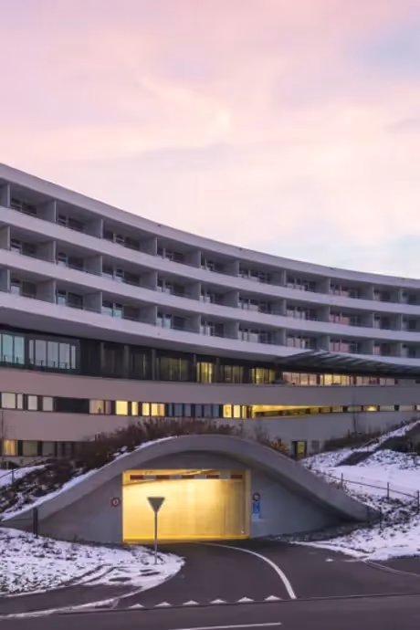 Charakteristisch für das Spital Linth ist das bereits teilsanierte Bettenhochhaus mit seiner kraftvollen Gebäudevolumetrie. Auf der