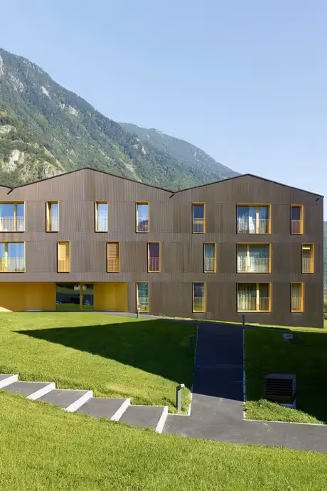 Sur l’extérieur, une nouvelle isolation périphérique crépie de 20 centimètres a été posée afin de réduire fortement la consommation d’énergie des bâtiments. Cette recherche d’économie d’énergie s’est complétée par le biais d’une isolation sur dalle au niveau des combles et sous-plafond pour le sous-sol des bâtiments. La rénovation complète de la cage d’escaliers a permis de passer du double vitrage au triple vitrage, y compris pour la porte d’entrée des immeubles. Les garde-corps des balcons ont été mis en conformité avec une finition en verre pour l’immeuble Taudaz 4 et en métal déployé pour celui de Taudaz 9. Quant aux volets présents à l’origine, ils ont été remplacés par des stores métalliques. Les stores en toiles ont également été changés au profit de stores de couleur unie.