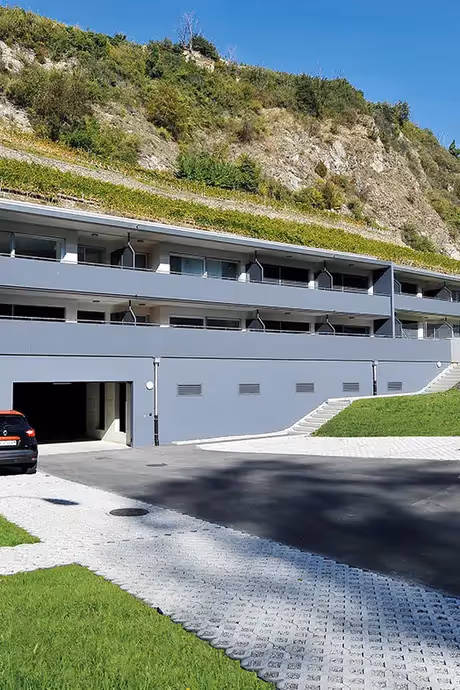 Le maître de l’ouvrage, la FAH, a choisi d’implanter cette nouvelle structure dans une zone résidentielle au cœur du village de Belfaux. Son but étant ainsi de favoriser l’autonomie et l’intégration des résidents. Sur la parcelle choisie, il y avait un ancien garage-étable qui a été conservé et rénové pour devenir un atelier et une maison déjà existante (propriété de l’accompagnatrice principales des résidents). Il a fallu composer avec un terrain très pentu de plus de six mètres de dénivelé entre son point haut (côté route) et l’angle de la terrasse (côté jardin). Le défi était de réaliser une habitation de plain-pied adaptée aux personnes à mobilité réduite, accessible dès le trottoir par des pentes douces (entre 2 et 4%). Pour cela, il a fallu creuser et construire un mur de soutènement contre la route communale.