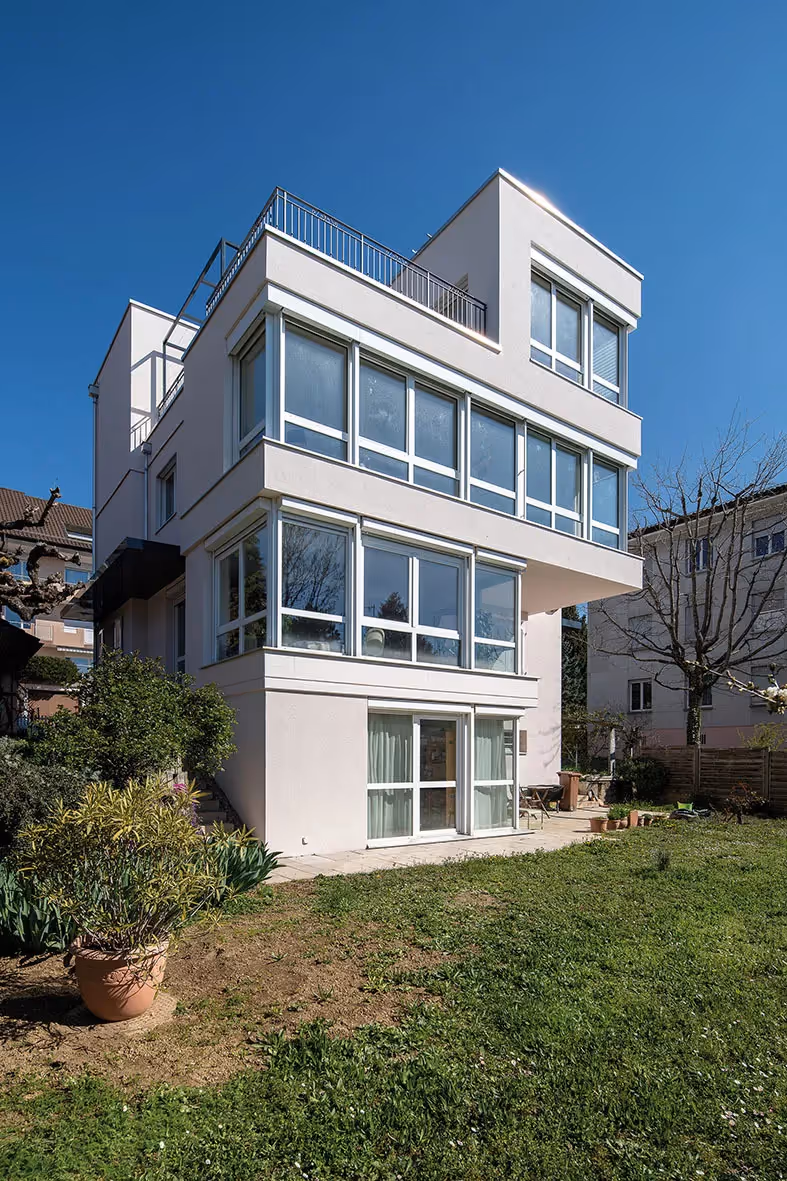 Après une étroite collaboration avec les propriétaires, le programme le plus adapté à leurs modes de vie, a pu être défini avec les architectes. En résulte un immeuble se développant sur trois niveaux hors terre et un niveau semi-enterré. Le rez inférieur se compose d’un local technique, d’une cave, d’une buanderie et d’un local disponible avec accès indépendant. Le rez supérieur présente une entrée avec les espaces de jour, et le premier étage déploie a contrario la zone de nuit. Le nouvel attique offre désormais un agréable espace avec terrasse permettant de contempler la magnifique vue sur le lac Léman.