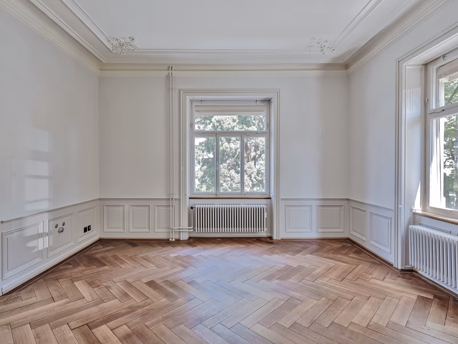 Die Südostecke wird von halb ins Volumen eingezogenne, gedeckten Loggien gebildet. Pflanzen imitierende Gusseisengeländer, teilweise ornamentierte Parkettböden, farblich hervorgehobene Stukkaturdecken und Wandtäfer aus Holz geben dem Treppenhaus, den Korridoren und den Haupträumen einen repräsentativen Charakter.