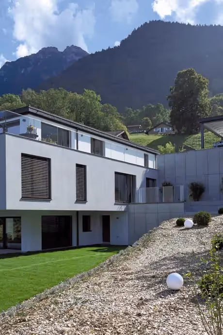 Par le biais d’une double hauteur sur le séjour, les villas bénéficient d’une belle lumière intérieure à tous les niveaux, ainsi qu’un sentiment d’espace. L’aspect compact de la construction, dépourvu de décrochements superflus, permet d’isoler facilement les villas, malgré l’épaisseur conséquente exigée pour l’obtention du label Minergie.