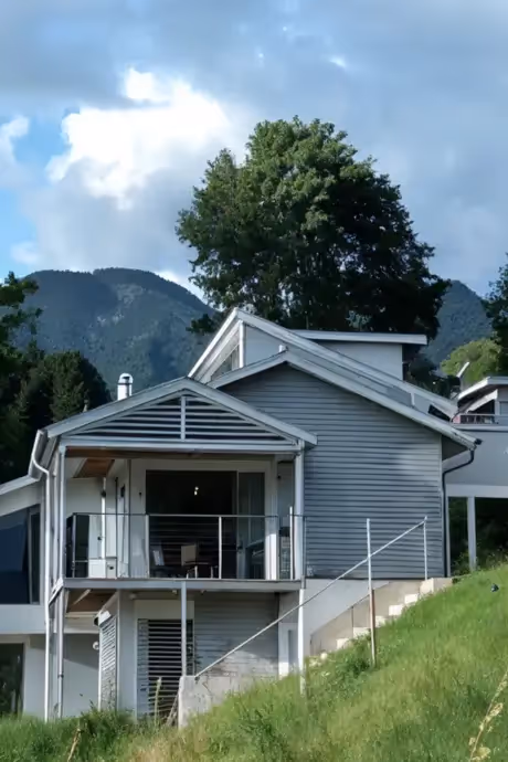 Villas contemporaines aux portes de Genève. Entre Ferney-Voltaire et Bellevue, la commune de Chambésy bénéficie d’une situation calme, malgré  les grands axes routiers en direction de Genève. C’est sur un terrain libre de 850 m2, que deux villas identiques, contigües ont été construites dans un quartier résidentiel, proche d’une zone boisée.
