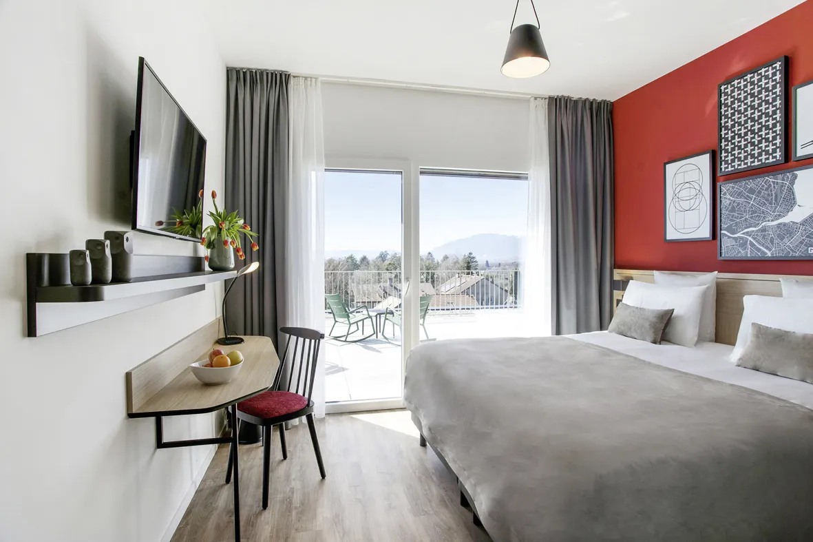 La façade est entrecoupée de larges ouvertures vitrées toute hauteur, offrant une vision généreuse sur le paysage et la nature environnante, aussi bien dans les espaces bureaux que dans les appartements de l’appart-hôtel, ce qui allège visuellement le côté imposant du béton préfabriqué. L’attique en retrait sur les trois bâtiments offre la possibilité de créer de vastes terrasses.Les trois niveaux de sous-sols ont nécessité la mise en place d’une paroi berlinoise afin de maintenir la route de Peney qui longe les bâtiments. Le projet, situé sous le couloir aérien de l’aéroport de Genève, a nécessité une attention particulière dans son développement afin de respecter les exigences acoustiques accrues dictées par le programme mixte.